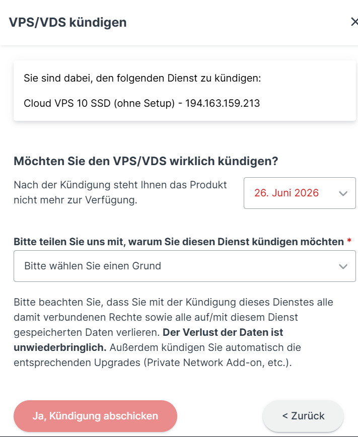 Weitere Infos zur Beantragung der Stornierung findest du im Artikel Wie kann ich mein Contabo Konto schließen oder einen Contabo Dienst kündigen?