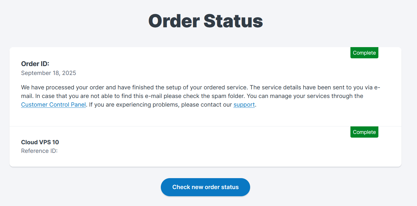 After purchasing a Contabo product, you can track your order status at any time using our Order Status page.
