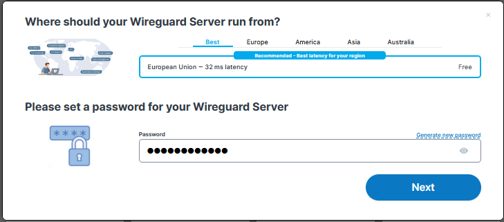 2. Select the location you want your server to run from and set the password for your server. Important: The password will be used both for accessing the VPS and the application itself.